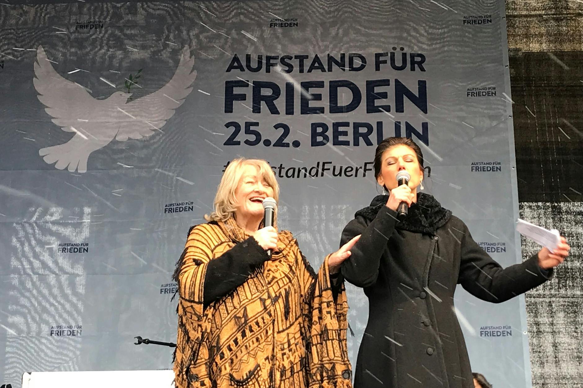 Die Demo sollte ein starkes Zeichen für den Frieden sein. Web 10 hours agoFriedensdemonstration in Berlin Scheinriesinnen Sahra Wagenknecht und Alice Schwarzer hatten zur Demo Aufstand für Frieden ans Brandenburger Tor. Nun verbietet die Polizei bestimmte.